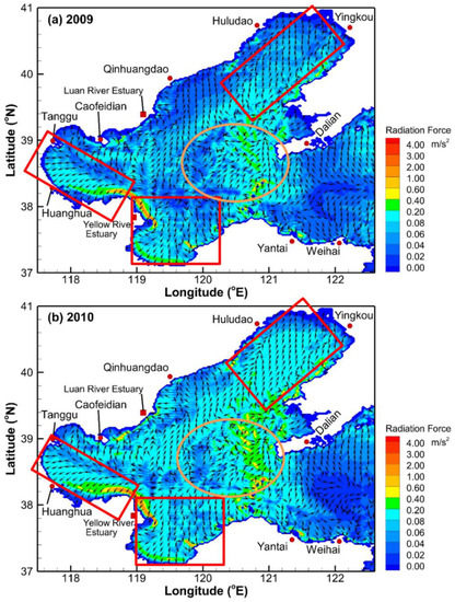 Wave force distributions in the Bohai Bay during the 2009 (a) and 2010 (b) storms (at the time step for which the surge in the south Bohai Sea peaks). The red rectangles represent the regions with a unidirectional wave force and the orange circles represent the regions with a non-uniform wave force.
