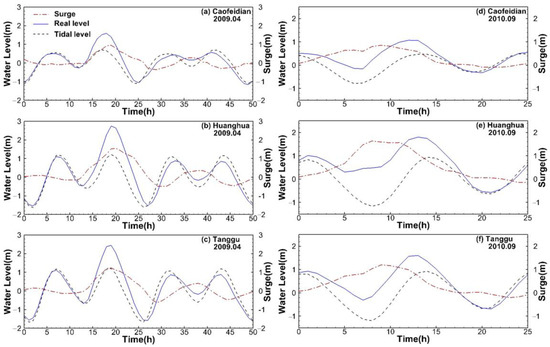 Figure 12a–c show the variations of the surges during the storm on 13 April 2009. By comparing the surge levels with tides to those without tides, it can be seen that the peak surges are significantly reduced when considering the influence of the tide, especially at Huanghua and Tanggu. This indicates that methods used to forecast or hindcast the peak water level of a storm surge occurring at high tide by adding the water levels driven by wind (and wave) (i.e., run 2 or run 3) to those driven by tide (run 1) are not suitable for the Bohai Sea. This can be explained by two reasons. Firstly, M2, which is the dominant tidal component in the Bohai Sea, has a wavelength (~600 km) of approximately twice the spatial scale (~300 km) of the Bohai Sea [41]. When the western coast of the Bohai Bay experiences high tide, the water level in the central part of the Bohai Sea and the Bohai Strait is relatively low. Under these conditions, the gravity force hinders the inflow of water from the central basin of the Bohai Sea to the western part of the Bohai Sea. This explains that the peak surges calculated by considering the tide in run 4 are lower than those without tides in runs 2 and 3. Secondly, an increase and decrease of water depth caused by flood and ebb tides is related to wave deformation in shallow water regions. As mentioned above, wave deformation in shallow water regions causes a significant set-up, which raises the water level in the coastal region. However, during high tide, water depth is higher, weakening the wave deformation near the coast and thereby also the longshore currents. If the surge is calculated without considering tidal effects, the water depth at the coast is lower than the real hydrodynamic conditions in which waves propagate. Due to the underestimation of water depth, the modelled wave deformation is overestimated and thereby the calculated set-up becomes more obvious in the coastal region. By comparing the water depth at the three locations, it can be found that the water depths at Huanghua and Tanggu are smaller than that at Caofeidian (Figure 1). The model results show that the tidal amplitudes at Huanghua and Tanggu are larger than that at Caofeidian. As a result, for the surge of 2009, the differences between the peak surge values calculated by runs 3 and 4 vary with the location (Figure 12a–c), with significant differences at Huanghua and Tanggu and a lower difference at Caofeidian.