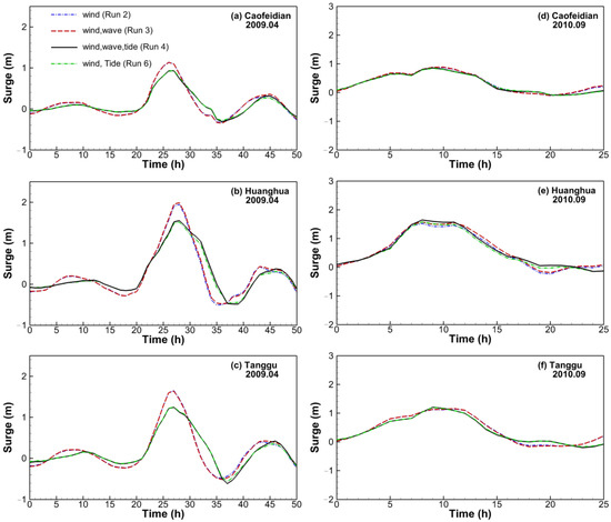 Simulated surges at Caofeidian (panels (a,d)), Huanghua (panels (b,e)), and Tanggu (panels (c,f)) during the 2009 event (panels (a–c)) and 2010 events (panel (d–f)) with consideration of wind (run 2, dashed blue line), wind and waves (run 3, dashed red line), wind, waves and tide (run 4, black line) and wind and tide (run 6, dashed green line).