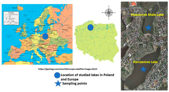 Karczemne Lake (54°19′42” N, 18°11′27 E) and Klasztorne Małe Lake (54°20′21” N, 18°11′35” E) are part of the river–lake network in which the natural outflow of water occurs in the following direction: Lake Mielenko—Lake Karczemne—Lake Klasztorne Małe—Lake Klasztorne Duże—Klasztorna Struga—Słupinia—Radunia—Motława—Baltic Sea. Karczemne and Klasztorne Małe lakes are strongly degraded, urban reservoirs located in the Kashubian Lake District and belong to the macroregion of the Eastern Pomeranian District in Kartuzy town (Figure 1) [31].