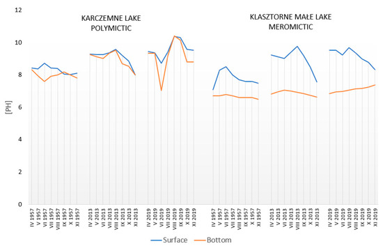 In 1957, the pH of the bottom water layers of Karczemne Lake ranged from 7.81 to 8.32 (a mean value of 7.97 ± 0.223), and in Klasztorne Małe Lake, the pH of the bottom water layers ranged from 6.50 to 6.80 (a mean value of 6.65 ± 0.092) (Figure 2 and Figure 3). In the subsequent research years, the pH values of the analyzed lakes increased. A particularly steep pH increase was observed in the polymictic Karczemne Lake. In 2019, the pH of the surface water layers of Karczemne Lake ranged from 9.37 to 10.41 (average pH, 9.59 ± 0.536). In the near-bottom water layers of the reservoir, the pH was slightly lower and ranged from 8.81 to 10.41 (average pH, 9.37 ± 1.020) (Figure 2 and Figure 3). In 2019, in the surface water layers of the meromictic Klasztorne Małe Lake, the pH value ranged from 8.31 to 9.70 (average pH, 9.17 ± 0.465), and in the near-bottom water layers, the pH varied between 6.85 and 7.38 (average pH, 7.09 ± 0.140) (Figure 2 and Figure 3). Over 60 years, the pH of the surface layers of Karczemne Lake increased by 15%, and that of the bottom layers increased by 17%. In turn, in the surface waters of Klasztorne Małe Lake, the water pH value increased by 15%, while in the bottom layers, the water pH value increased by 7%.