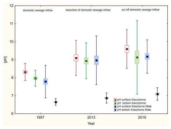 Mean annual values of pH (box ± SEM; whisker plots ± SD) in the water of Karczemne and Klasztorne Małe lakes.