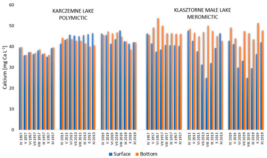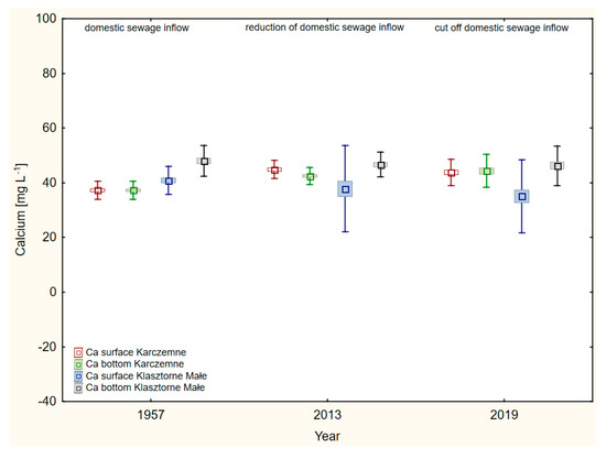The statistical analysis of the results revealed that the municipal sewage discharge resulted in a significant change (α < 0.05) in the calcium content of the water of the polymictic Karczemne Lake, but it did not cause a significant change in the magnesium content of the water of both the analyzed lakes (polymictic and meromictic) and in the calcium content of the water of Klasztorne Małe Lake (meromictic) (Table 2). In all research years (domestic sewage inflow, after decreasing domestic sewage inflow, and after stopping domestic sewage inflow), the calcium content throughout the water column of Karczemne Lake ranged from 35.1 to 47.3 mg Ca L−1, and its average value fluctuated around 41.6 ± 2.34 mg Ca L−1 (Figure 4 and Figure 5). In the period of 1957–2019, throughout the entire water column of Klasztorne Małe Lake, the calcium content varied between 25.0 and 53.7 mg Ca L−1 (the mean value oscillated around 42.4 ± 2.2 mg Ca L−1,) (Figure 4 and Figure 5).