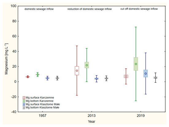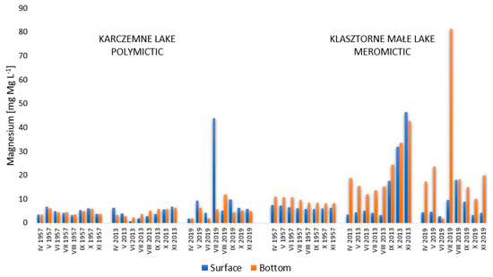 In all research years (domestic sewage inflow, after decreasing domestic sewage inflow, and after stopping domestic sewage inflow), the magnesium content throughout the water column of Karczemne Lake ranged from 0.8 to 44.0 mg Mg L−1, and its average value fluctuated around 5.86 ± 4.36 mg Mg L−1 (Figure 6 and Figure 7). In the research years from 1957 to 2019, throughout the entire water volume of Klasztorne Małe Lake, the magnesium content varied between 2.8 and 81.5 mg Mg L−1 (mean value, 13.8 ± 9.52 mg Mg L−1) (Figure 6 and Figure 7).