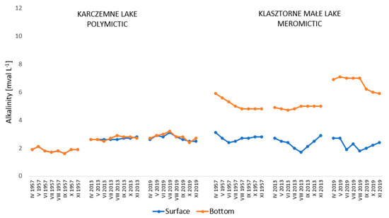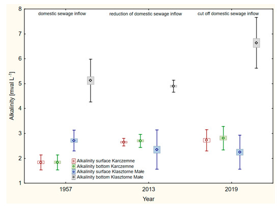 In the year with domestic sewage inflow (1957), throughout the entire water column of the polymictic Karczemne Lake, the alkalinity remained the same. The average water alkalinity was 1.83 ± 0.150 mval L−1 (Figure 8 and Figure 9). After 60 years of domestic sewage inflow, the alkalinity of the water of Karczemne Lake increased almost twice (2019). The average alkalinity values were similar between the surface water layer (2.74 ± 0.212 mval L−1) and the near-bottom water layer (2.81 ± 0.236 mval L−1) (Figure 8 and Figure 9).