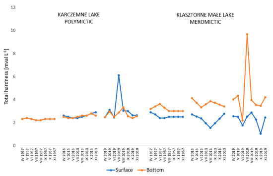 In 1957 (domestic sewage inflow), the total hardness throughout the water column of the meromictic Klasztorne Małe Lake varied from 2.4 to 3.6 mval L−1, and its average value fluctuated around 2.86 ± 0.199 mval L−1 (Figure 10 and Figure 11). In the period from 2013 to 2019, in the surface water layer of the lake, the total hardness varied between 1.0 and 2.8 mval L−1 (average value, 2.25 ± 0.503 mval L−1), while in the near-bottom water layer, it ranged from 2.1 to 9.6 mval L−1 (mean value, 4.030 ± 1.238 mval L−1) (Figure 10 and Figure 11).