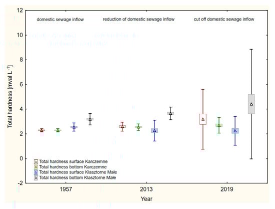 In 1957 (domestic sewage inflow), the total hardness throughout the water column of Karczemne Lake varied from 1.8 to 2.7 mval L−1, and its average value fluctuated around 2.2 ± 0.342 mval L−1 (Figure 10 and Figure 11). In the period from 2013 to 2019, in the surface water layer of the lake, the total hardness varied between 2.4 and 6.1 mval L−1 (average value, 2.88 ± 0.694 mval L−1), and in the near-bottom water slayer, the total hardness ranged from 2.3 to 3.3 mval L−1 (mean value, 2.620 ± 0.225 mval L−1) (Figure 10 and Figure 11).