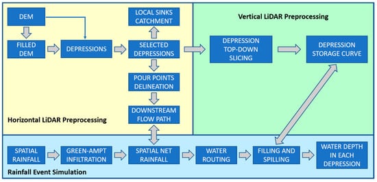 Although their hydrologic importance has been long recognized (see e.g., [,,]), surface depressions have not been extensively studied. The first studies that considered depression storage in hydrologic modeling dates back to the late 1970s [,]. The authors proposed a 4-direction raster-based technique to characterize their geometric properties and hierarchical nested structure using Digital Surface Models (DSMs).