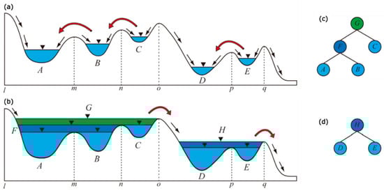 Schematic representation of the Hierarchical Filling-&-Spilling method: (a) nested-depression system, and (b) blue-spots G and H under fully-filled conditions with illustration of the second-level depressions (F, C, D and E) and third-level depressions (A and B); panels (c) and (d) report the hierarchical tree of the nested depression systems on the left and the right hand side, respectively, by using different colors for different vertical hierarchical order (adapted from []).