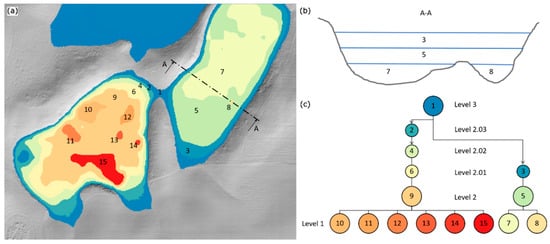 Schematic representation of the hierarchical structure of nested depressions. (a) Plan view of the intermediate-level depressions, each one associated with a specific color and identification code (ID, from 1 to 15). (b) Cross-sectional view A-A of the depressions 3, 5, 7, 8 identified in panel (a). (c) Hierarchical tree of the nested depression systems: intermediate-level depressions are represented with circles (see ID and color in panel (a)); the corresponding hierarchy level of filling for the bottom-up flooding phase is indicated with numbers from 1 to 3 (2.01, 2.02, 2.03 indicate intermediate levels).