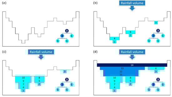 Example of four different intermediate steps (from a to d) in the application of the bottom-up level-set depression flooding phase: dry domain (a), bottom-up level-set methods for partial filling, while simulating the flooding resulting from a given rainfall event (c,d).