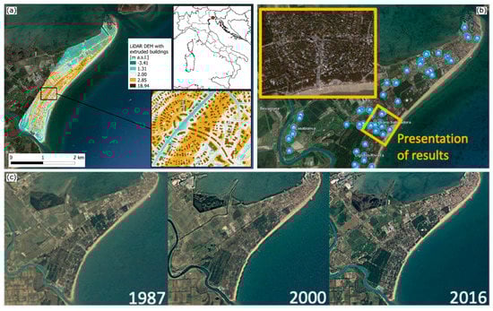 Lignano Sabbiadoro is a municipality in the extreme South-western area of Friuli Venezia Giulia, North-eastern Italy (Administrative district of Udine, see Figure 5), counting about 7000 permanent residents and a population in excess of 200,000 people during the summer touristic season. The municipality consists of an 8-km long peninsula that is 1430 hectares wide. The peninsula separates the Grado and Marano lagoon from the Adriatic Sea and is located on the left wing of the large delta system of the Tagliamento River, with a low and sandy coast and a morphology characterized by the presence of sand dunes that form the southern ridge of the area. From the sea towards the inner part, the territory consists of a series of strips parallel to the coastline almost totally dried up by land reclamation, and the lagoon side, with embankments, sandbanks and mudflats. The land-use dynamics in this area are influenced by the strong touristic vocation of the district, which resulted in intense urban development in the last 35 years (see panel (c) in Figure 5). In particular, the strip towards the sea is almost totally urbanized. The remaining part of the territory mainly consists of flat areas, substantially derived from the reclamation of ancient lagoon areas.