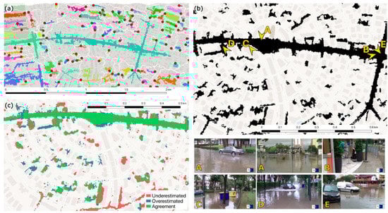 Results of the application of Safer_RAIN to the case study of Lignano Sabbiadoro: (a) identification of blue-spots (binary maps, where each blue-spot is marked with a different color), spilling points (red dots) and watersheds (white lines); (b) identification of the flooded area resulting from the rainfall depth of 124 mm recorded for the urban flash-flood of the 11 September 2017; pictures (source: local TV-news footage, TGR Friuli Venezia Giulia) are provided for some points to highlight the ground evidence of flooded area; (c) comparison with a hydrodynamic model (red, blue and green colors indicate underestimation, overestimation and agreement, in this order).