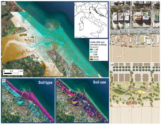 Geographic and topographic setting of Rimini, Northern Italy: (a) location of the case study and 1 m LiDAR Digital Elevation Model (DEM) with extruded buildings; (b) soil-type and land-use maps for the study area; (c,d) current layout of the seafront (satellite image) and future green infrastructure according to the rehabilitation and renovation project Parco del Mare.
