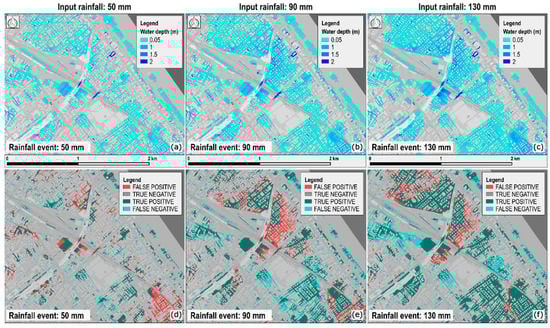 Rimini case study: flooding phase output. (a–c) Water depth maps obtained under the assumptions of spatially uniform rainfall and impervious terrain and relative to three different synthetic rainfall depths (color-scale represents water depth values). (d–f) Comparison between Safer_RAIN and Hydro_AS-2D outputs: images report a classification of pixels into false positive (FP), true positive (TP), false negative (FN), and true negative (TN).