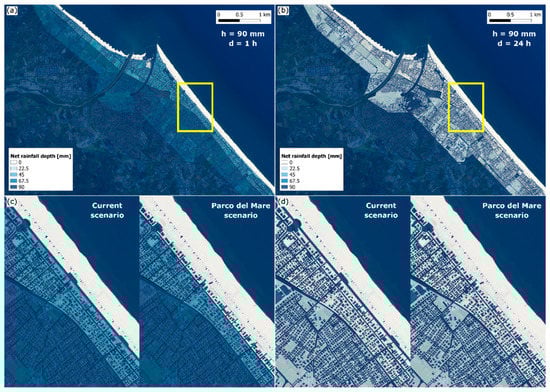 Rimini case study: rainfall events used for assessing the effectiveness of Parco del Mare urban green-infrastructure. (a,b) Spatially variable net-rainfall maps relative to the current land-use scenario and to two uniformly-distributed events having same rainfall depth (i.e., 90 mm) but different duration, (a) 1 h (return period of ~300 years), and (b) 24 h (return period of ~3 years), and spatially variable infiltration losses (see also Section 2.2). For the area identified by the yellow boxes, panels (c) and (d) compare the net-rainfall maps for the current and Parco del Mare land-use scenarios and for the 1-h and 24-h events, respectively.