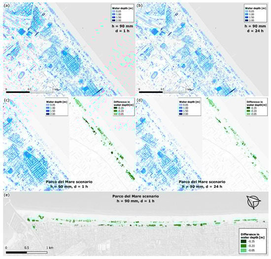 Rimini case study: water depth maps simulated with Safer_RAIN for the two considered synthetic events (see also Figure 9): 1-h (a) and 24-h (b) rainfall events for the current land-use scenario; (c,d) simulated water depth for the 1-h (c) and 24-h (d) rainfall events and the Parco del Mare land-use scenario (urban green-infrastructure, left) and differences in water depth compared to the current layout (right); (e) 90 mm 1-h rainfall event, simulated water depth for the Parco del Mare urban green infrastructure minus the simulated water depth for the current land-use scenario along the seafront.