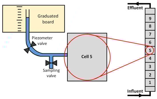 The piezometers and the sampling valves were continuously kept opened and closed, respectively. At each sampling campaign, all water levels were read first. Then, for each cell, the piezometer valve was closed, the sampling valve was slowly opened, and the first 30 mL was discarded before taking the sample. The head loss at cell j was defined according to Equation (3):