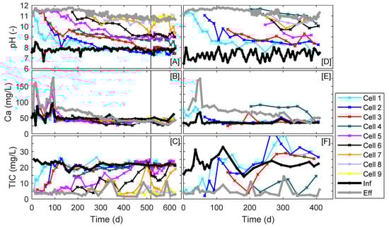 Water composition in columns 1 (A–C) and 2 (D–F). The influent flow rate of column 1 was reduced from 6.9 ± 1.3 mL/min to 3.4 ± 0.5 mL/min at time 517 d (indicated by a vertical line). Note that calcium and TIC in column 2 were analyzed only in cells in which significant exhaustion occurred (cells 1 to 4), while the sampling frequency was higher in column 1 for modelling purposes [].