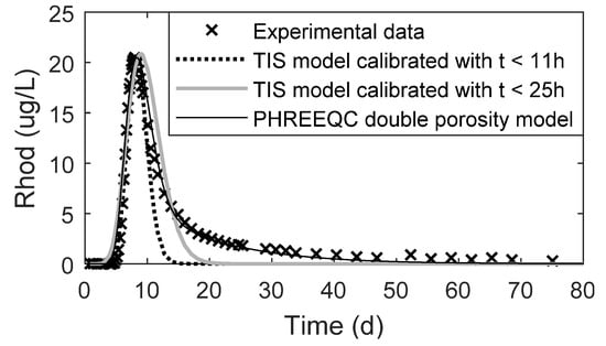 A comparison of tracer test calibration using the PHREEQC double porosity model and the TIS model is shown in Figure 3. Two TIS calibrations are presented using partial data (t ≤ 11 h or t ≤ 25 h) in the optimization step. Calibrated parameters were N = 28.2 and TRHVe = 8.5 h for TIS-11 h; N = 12.9 and TRHVe = 9.8 h for TIS-25 h; and D* = 5 cm, Dn = 5 × 10−6 s−1 and HRTVe = 9.4 h for the PHREEQC model. The PHREEQC double porosity model resulted in a better calibration than the TIS model. The TIS model can either calibrate the peak or part of the tail, depending on the number of data points considered in the optimization. Adding data to the optimization step slightly improved tail fitting, but peak fitting was shifted. The better accuracy of the PHREEQC double porosity model can be explained by its greater complexity which involves three calibration parameters for effective volume, dispersion, and retardation, compared to the TIS model which involves only two parameters for effective volume and dispersion.