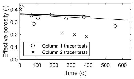 The evolution of effective porosity was determined based on tracer test calibration. Each tracer test was simulated using the software PHREEQC and its double porosity model [], using MATLAB-PHREEQC functions launch_tracertest.m and PHREEQCfct_tracer.m provided in Supplementary Materials. Briefly, the TRANSPORT module in PHREEQC simulates a 1D flow in a column. The column is divided into n numerical cells, each of which is completely mixed and hosts kinetic reactions defined by the user. Advection is simulated by the shift of solutions from one cell to the other. Dispersion is simulated by partial mixing of solutions in adjacent cells. The double porosity feature simulates retardation by adding n immobile cells adjacent to mobile cells. Solute exchange between mobile and immobile cells is computed by partial mixing and no advection is possible in immobile cells. The hydraulic parameters used in PHREEQC are the effective hydraulic retention time of voids (HRTVe, h), the dispersivity (D*, cm), and the exchange factor between mobile and immobile cells (Dn, s−1). Each tracer test was calibrated by heuristic optimization of the hydraulic parameters.