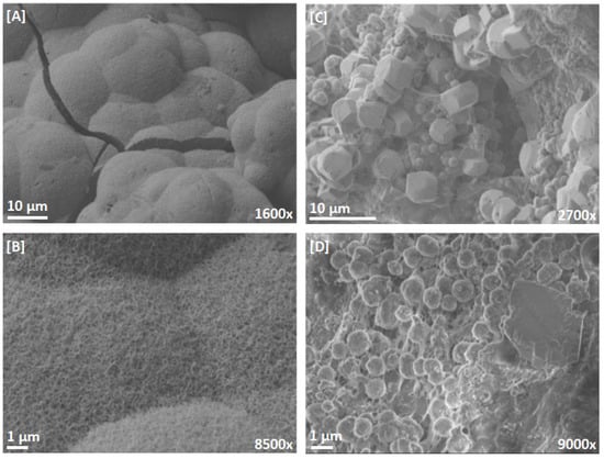 Crystal organization in steel slag filters fed with inorganic (panels (A) and (B)) and organic (panels (C) and (D)) soluble influents. Panels (A) and (B): Column 1 cell 2. Panel C: Column 2 cell 9. Panel (D): Column 2 cell 6.