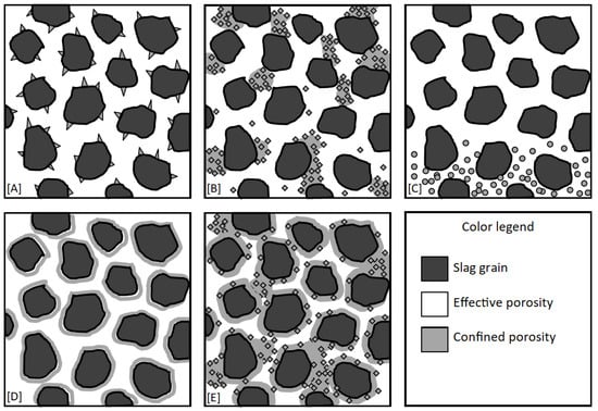 Types of clogging in steel slag filters and their effect on effective porosity. (A): Chemical precipitation with organized structure. (B): Chemical precipitation with disorganized structure, leading to the formation of confined zones. (C): Accumulation of nondegradable (inorganic or organic) suspended solids from the influent, (inlet at the bottom of the figure). (D): Formation of a biofilm on the slag grain surface. (E): Hypothesized combined effect of biofilm and disorganized crystal structure, leading to an increased formation of confined zones.