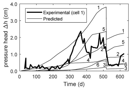 Pressure head buildup in cells 1 to 6 of column 1. The cell number is indicated next to each predicted line. The sudden reduction of pressure head at t = 517 d is caused by the reduction of influent flowrate from 6.9 ± 1.3 mL/min to 3.4 ± 0.5 mL/min.