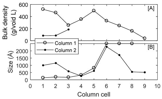 The Kozeny–Carman relationship predicted a progressive increase of pressure head within the whole column; especially in cells 1, 5, and 2. The predicted pressure head results from the hypothesis behind many predictive equations for hydraulic conductivity: any particle in the granular media blend contributes to the hydraulic conductivity. In the case of column 1, the mass of precipitates is distributed within the whole column, with peaks in cells 1, 5, and 2 (Figure 8A). The predicted pressure head build-up in cells 2 and 5 is not observed in experimental data, a pressure increase was observed only in cell 1. This illustrates the limitations of traditional models of prediction of hydraulic conductivity of granular media used in applications with non-natural granular blends.