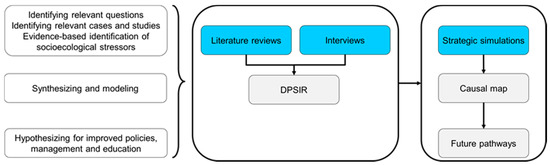 We developed, assembled, and used multiple lines of evidence [38] across the Drivers–Pressure–State–Impact–Response (DPSIR) framework. Qualitative data from literature reviews, interviews, and strategic simulations were combined (Figure 1).