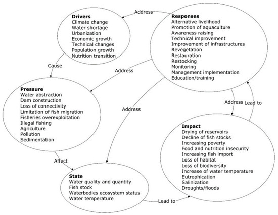 Water resources are among the fundamental resources that are the most threatened worldwide by various pressures. This study applied the Driver–Pressure–State–Impact–Response (DPSIR) framework as an innovative tool to better understand the dynamic interlinkages between the different sources of multiple stressors on aquatic ecosystems in Burkina Faso. The triangulation of evidences from interviews, literature reviews, and strategic simulations shows that several human impacts as well as climate change and its effects (such as the decrease of the water level, and the increase of the surface water temperature) are detrimental to fish productivity, abundance, and average size. Furthermore, the ongoing demographic and nutritional transition is driving cumulative pressures on water and fish resources. In this context, the development of aquaculture could offer alternative livelihoods and help fish stocks in natural ecosystems to recover, thereby reducing fishermen’s vulnerability and easing overfishing pressures. Further, the empowerment of the actors and their participation to reinforce fisheries regulation are required to escape the current “regeneration trap” and to achieve a sustainable management of aquatic ecosystems in Burkina Faso.