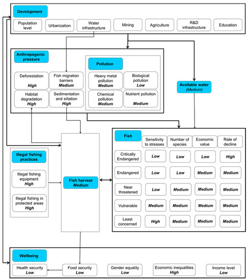 Similar changes to fish stocks result from the physiological stress caused by decreases of water quality and water quantity [79]. Decreasing water volume accelerates rising trends of water temperature and, hence, the deterioration of water quality. Water quality pressures occur especially in urban areas and agricultural areas [80]. Indeed, pollution through waste dumping in urban areas, pesticides and fertilizer input through agriculture, as well as eutrophication are detrimental to water quality.