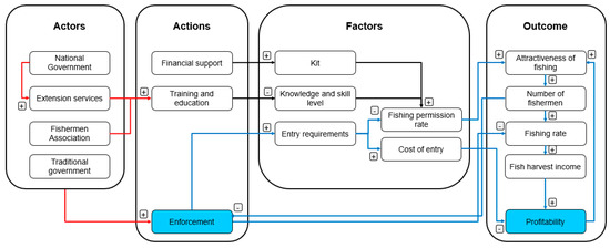 Governance failures leading to overfishing. The first variable to change is at the origin of the arrow, then the variable at the receiving end of the arrow will respond with a change. Regarding the “polarity”, “+” shows that an increase or decrease in the first variable is matched by the same change in the receiving variable, “-“ shows that the variables change in opposite directions. Actors: stakeholders for enforcement; actions: current measures; factors: elements that potentially could be provided by enforcement, training, and financial support to improve fishing governance; red arrows: interactions that are not established but could help make fisheries sustainable if instituted and established as standard parts of governance; blue arrows: feedback loops; outcome: potential results in terms of profitability; kit: fishermen’ equipment. Source: modified after Sendzimir [85].
