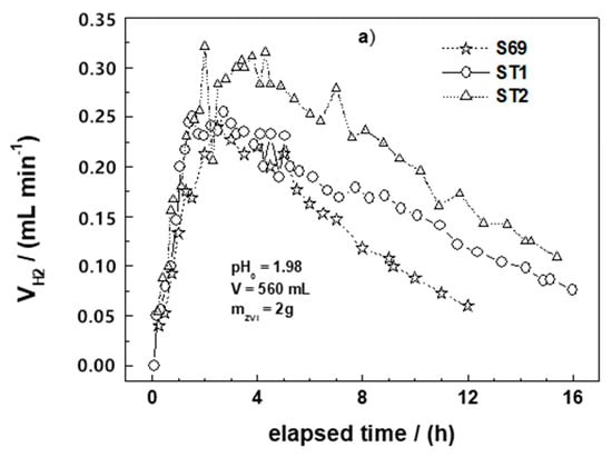 Apart from ST1 and ST2 experiments, which were terminated after 16 h, the recordings of the volumes of H2 produced by individual Fe0 materials were stopped after 24 h. However, to enable a good comparative discussion, Figure 3 presents only the evolutions of the H2 production rates recorded during the first 16 h of experiment for all materials. Changes in the concentrations of H+ (pH value) and iron were not recorded. It is however obvious that both values continuously increased until the end of the experiment [32]. Table 4 summarizes these results.