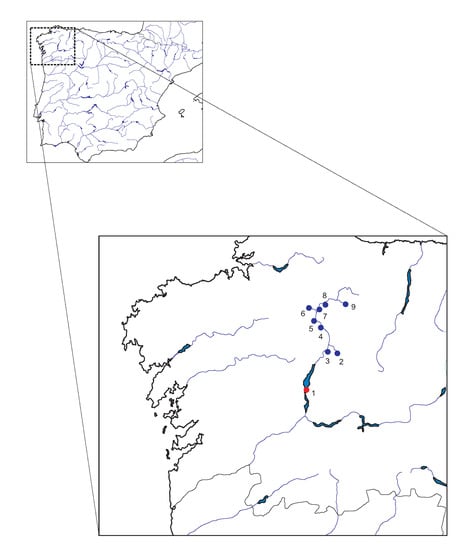 Geographical location of the meteorological stations (blue dots) and the Belesar reservoir (red dot). (1) Belesar reservoir; (2) Sarria river (Pobra de S. Xulian); (3) Neira river (O Paramo); (4) Miño River (Lugo); (5) Narla river (Gondai); (6) Ladra river (Begonte); (7) Miño River (Cela); (8) Miño River (Pontevilar); and (9) Azúmara river (Reguntille).