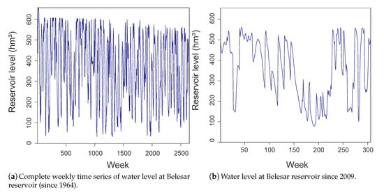 Belesar is a dammed water reservoir on the Miño River in Galicia (42.628889 N, 7.7125 W), Spain, built in 1963 [30]. Its maximum capacity is 655 hm, with a surface of 1910 ha. Belesar reservoir was created as part of a hydropower project, together with a hydropower station. This reservoir is also used for human consumption in the zone. Figure 1 shows the reservoir location at the north-west of Spain. Dammed water level (hm) daily data (complete 51 years) are available since the beginning of the reservoir operation, on 1 October 1963, until 30 September 2015. Note that an expansion work in the power generating section of the dam was carried out in 2011, which required the reservoir to be drained almost completely from spring to winter. We therefore skipped 2011 in this study. We considered weekly data, by averaging the daily dammed water level in weekly periods, obtaining a total of 2704 data samples. Observe that, in the long-term analysis, we only considered data from the dammed water level historic time series at Belesar. However, for short-term analysis, exogenous variables must be considered to obtain atmospheric and hydrological information to feed the ML models. This way, we also considered data from nine measuring stations located upstream Miño River and on its tributaries. Figure 2 shows the time series of weekly water level at Belesar reservoir. Figure 2a shows the complete series from 1964 to 2015. We used it to evaluate the long-term prediction and analysis methods. Figure 2b shows the time series since 2009, when data from upstream measuring stations are available. We considered in the latter dataset the results obtained in short-term prediction by the ML regression methods. The descriptive statistics for both cases (complete series and series since 2009) are shown in Table 1.
