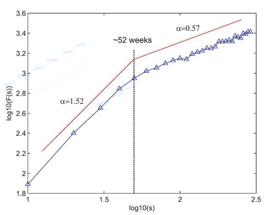 We first applied the DFA algorithm to the complete time series of dammed water level at Belesar. Figure 5 shows the DFA obtained. As can be seen, there is a clear two-ranges structure with separation point at around 52 weeks, which matches a year duration. Up to 52 weeks, the dammed water level time series is extremely long-term correlated, as the correlation exponent (recall that an exponent represents an uncorrelated process). Over 52 weeks, the time series is mostly uncorrelated since the correlation exponent is , very close to . This result suggests a process with a strong annual period. This justifies the use of persistence-based techniques for analysis of the time series, such as the typical year approach or auto-regressive methods, as good options to obtain accurate long-term predictions of the weekly dammed water level at Belesar.