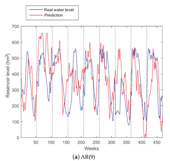 Figure 6a,b shows the performance of an AR(9) model (the best auto-regressive method obtained) and the typical year method for dammed water level prediction respectively. Note that, in both cases, we used as training set the values of the dammed water level time series from 1963 to 2006. The model parameters were estimated in the training set, and the results are reported in the test set. As can be seen, the AR(9) model fits most of the dammed water level series. In general, the AR model is able to estimate the trend of the dammed water level time series, obtaining a reasonable result.