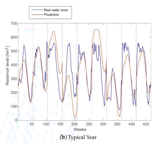 The fact that an AR model obtains good results in the prediction indicates that the prediction approach via typical year should also work fine in the prediction of water level at Belesar. This is also expected after the DFA analysis carried out at the beginning of this discussion. Figure 6b shows the performance of the typical year persistence-based method in the test set of Belesar. As can be seen, this approach is very effective in different years, which perfectly fit the typical year. There are, however, other years in which the typical year prediction does not work as well, which indicates that those years present anomalies in terms of the dammed water level, which may be associated with rainfall anomalies, droughts, etc. In general, the prediction given by the typical year is smoother than that of the best AR model found, which seems to indicate that the water level at Belesar has a very important intra-annual persistence, and a small inter-annual contribution, as shown in the DFA analysis of the dammed water level time series.