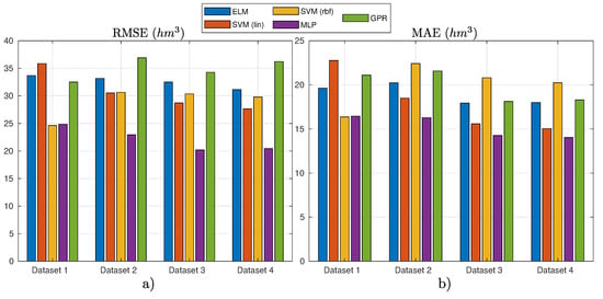 Results of the different ML regression techniques for different variables considered (datasets) in the case of standard data (all seasons) and temporal partitioning: (a) the RMSE results; and (b) the MAE results.