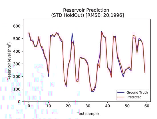 The best model in these set of experiments was an MLP with the input variables defined in Dataset 3 (see Table 2). Figure 8 shows the best prediction obtained by MLP in the test set, plotted against the ground truth. As can be seen, the prediction obtained by MLP is excellent, being close to the dammed water level ground truth. Note that, since random data were considered, there is no time relation between each of the samples shown, which does not allow checking how the regressor model manages the temporal character of the time series. However, observe that both RMSE and MAE values are extremely good, which indicates that MLP is able to obtain an extremely accurate weekly prediction of water level in reservoir based on the variables specified in Dataset 3.