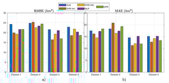Results of the different ML regression techniques for different variables considered (datasets) in the case of standard data (all seasons) and random partitioning: (a) the RMSE results; and (b) the MAE results.