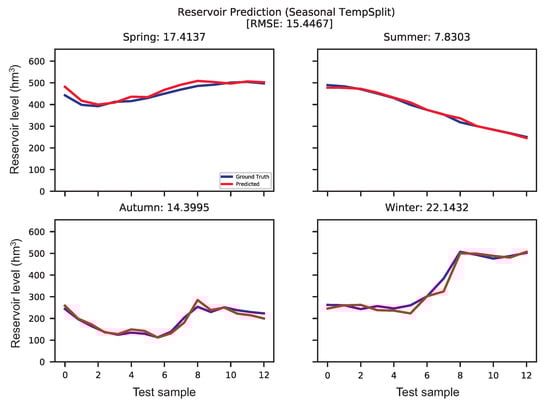 The results in Table 6 can be better interpreted if they are observed along with the predictions shown in Figure 11. It is easy to see that the most difficult season to predict seems to be winter, where the SVR (best model) uses the bare minimum information, only the upstream and tributaries’ flows. Note, however, that the same behavior is observed in summer, which is apparently the simplest season to predict (it seems to be quite linear with negative slope). In this case, it is the ELM regressor that provides the best result, also using Dataset 1 (upstream and tributaries’ flows). The complexity in winter seems to be well modeled by the SVR with RBF. In spring, the data seem fairly similar to summer, and they are modeled with a simple model, a linear SVR. In this case, it uses a higher number of variables (Dataset 3) to predict the apparent changes in trend of the data, which seem to first decrease, then increase, and slightly start to decrease again. The autumn data have more complexity, but they are modeled correctly with a GPR and a higher number of variables (Dataset 3).