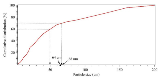 The simulated stormwater was produced according to the test water production method described in the Non-Point Pollution Reduction Facility Performance Test Manual of the Ministry of the Environment (NPPT manual), Korea [15]. Particles up to 200 μm were used in the preparation, and the product concentration was between 150 and 350 mg/L SS. According to the NPPT manual, particles under 64 μm account for 60% to 70% of the total volume; and particles that are 64 μm to 200 μm account for 20% to 30% of the total volume (Figure 1). The soil used to produce the test water was loess. The loess mixture was shaken in a 200-μm sieve shaker for 10 min. Loess particles smaller than 200 μm were stirred with a propeller in a 5-ton agitator. The stormwater produced in this way was pumped into the stormwater BMP device under test conditions at a maximum flow rate of 20 m3/h using a submersible pump (Model IP-835N-F, produced by Hanil electric Co., Ltd., Seoul, Korea).
