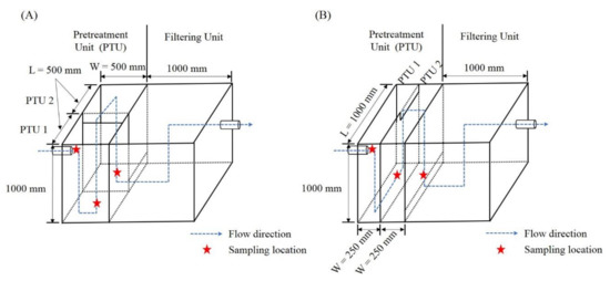 Schematic figure for stormwater best management practice (BMP) devices used in this study. The figure on the left (a) indicates the aspect ratio 1:1, and the figure on the right (b) indicates the aspect ratio 1:4. The dotted lines show the flow direction of the manufactured stormwater, and the stars indicate sampling points. Aspect ratio means that the ratio of width to length in the pretreatment unit.
