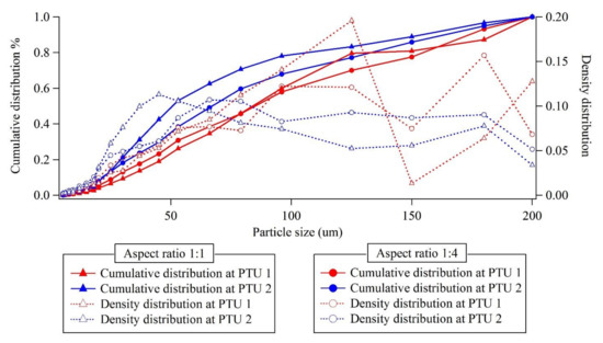 Particle density distributions for sediment on the bottom of each pretreatment unit. The eight lines indicate the cumulative distributions and density distribution for aspect ratios 1:1 and 1:4, respectively.