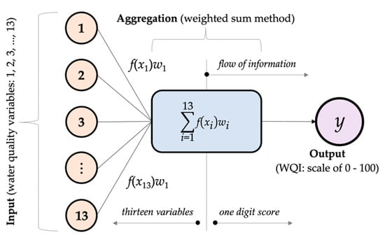 The mathematical structure and application of indexing models is normally governed by the degree of accuracy perceived and the type of weightage coefficients, which might be equally or unequally defined. Various aggregation methods exist, and each technique has its own formidable challenges; thus, the index developer has to decisively select the most appropriate and relevant indexing model, preferably one with fewer complications that might adversely influence the final index value. Otherwise, defining the best and absolute aggregation model is close to impossible. Since there is no supreme and favorable technique of formulating water quality indices (WQIs), various aggregation methods were tried and tested. The modified weighted sum (additive) method was found to be the most appropriate for the development of a universal water quality index for monitoring South African watersheds. The modified weighted sum (additive) method is represented in Equation (8) [,,].