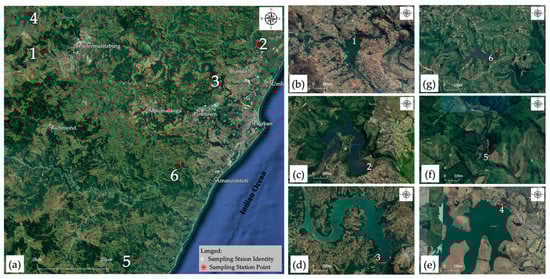 Locality map for sampling stations: (a) all six sampling stations, (b) Henley Dam, (c) Hazelmere Dam, (d) Inanda Dam, (e) Midmar Dam, (f) Umzinto Dam, and (g) Nungwane Dam.