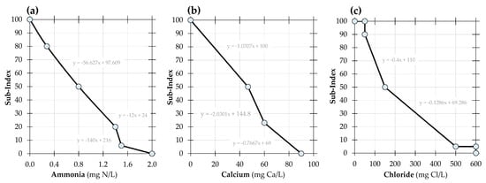 where SIa,b, …, c are sub-index functions for (a) ammonia, (b) calcium, (c) chloride; xa,b, …, c are the observed water quality reading of the respective water quality parameter. Due to the nature of the article, only sub-index rating curves and mathematical functions for NH3, Ca and Cl are presented herein; the rest are documented elsewhere.