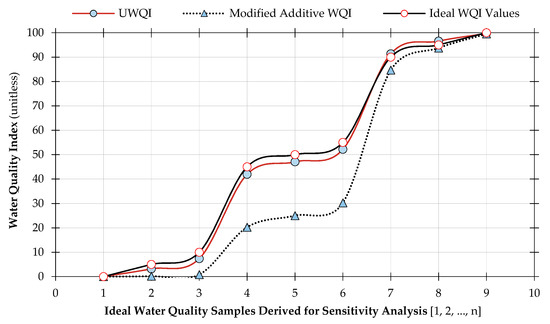 Plot diagram showing the results of the scenario-based analysis of the developed universal water quality index (UWQI) model and the modified additive water quality model against ideal water quality values derived from nine probable scenarios. The nine cases were represented as samples 1, 2, …, n, which correspond, respectively, to water quality index (WQI) values of 0, 5 and 10 (worst-cases), 45, 50 and 55 (base cases) and 90, 95 and 100 (best cases).